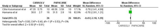 The meta-analysis (Figure 4) included only two studies [31,33] that compared the bond strength of self-etch adhesive (Clearfil SE bond) to caries-affected dentin after it was subjected to Carisolv™ and Papacarie™ treatment. The meta-analysis depicted that SE adhesive allowed to achieve similar bond strength to CAD whether it was treated with Carisolv or Papacarie.
