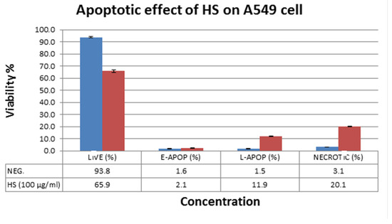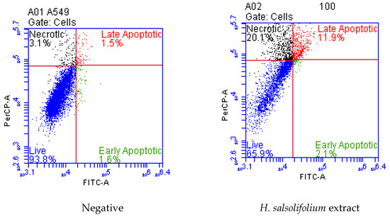 H. salsolifolium extract had a significant apoptotic effect in A549 cells at a dose of 100 μg/mL (2/1% early apoptotic and 11.9% late apoptotic, respectively) and apoptotic cell death increased depending on the dose increase (