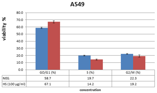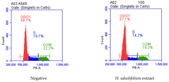 H. salsolifolium extract was applied to the A549 cells determined that the density of cells in the G0/G1 phase was 58.7% in the negative group, and the density of cells in the G0/G1 phase was determined to be 67.1% in the