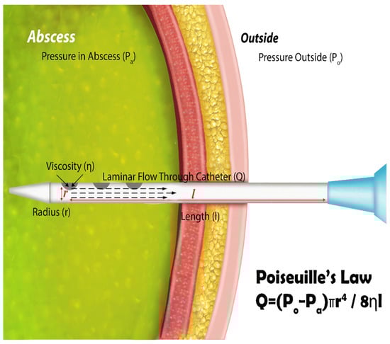 Fluid flows through drainage catheters from inside the body to the external collection bag in a laminar fashion according to Poiseuille’s Law ) (Figure 1). A greater pressure differential (P2 − P1, ) and a lower length factor (r) increase the flow of fluid through the catheter.
