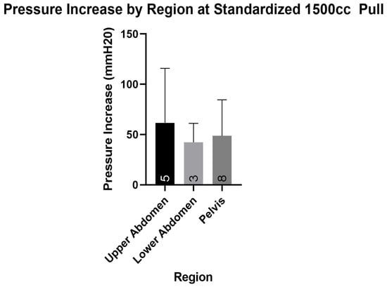 The region of catheterization was divided as either upper abdominal (n = 5, 25%), lower abdominal (n = 3, 15%), or pelvic (n = 8, 40%). At a standardized pull of 1500 cc, there was no significant difference in pressure increase by region (p > 0.999 in all comparisons, Figure 4).