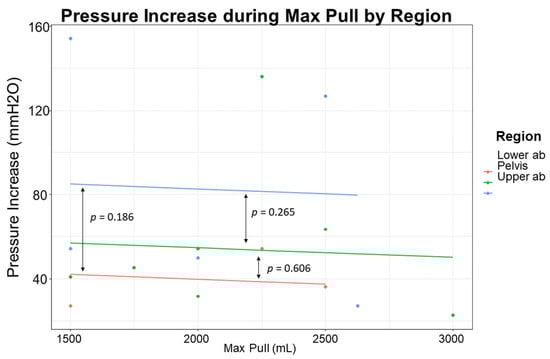 ANCOVA regression is graphically depicted comparing the pressure increases by region in Figure 5; p values are demonstrated between lines. At maximal inspiratory effort (average pull 1999 cc), pressure increase was non-significantly (p value range = 0.186 to 0.606) greater in upper abdomen catheterization than in lower abdominal or pelvic catheterization (adjusted R-squared = −0.044).