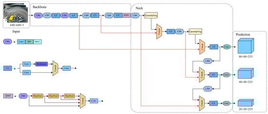 YOLOv5 has made significant improvements compared to previous YOLO models and is currently one of the more advanced models in object detection []. In YOLOv5, new techniques have been used, such as adaptive training data augmentation [], multi-scale training [], and multi-scale prediction for initial detection layers [], which make detection faster and more accurate. The YOLOv5 network model is shown in Figure 1. However, conducting character recognition on the surface of a tire is complex because the characters are molded into the tire and blend into the complex background. Additionally, dust on the surface of a tire further complicates character recognition. To address these issues and strengthen the network’s recognition capabilities, this paper proposes an improved model based on YOLOv5 for recognizing characters on the surfaces of car tires.