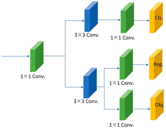 A decoupling head [] is a technique that separates convolutional layers from fully connected layers, reducing computational complexity and model size, thus improving model speed and efficiency. The traditional detection head in YOLOv5 is a coupling head [] that typically consists of a fully connected layer that converts the feature map outputs by convolutional layers into a prediction vectors. This fully connected layer is usually trained together with the convolutional layers, requiring significant computational resources and longer training times. In this study, the decoupling head was added to YOLOv5, with the aim of separating the classification and localization branches to reduce computational resources and training time, as shown in Figure 3. First, a 1 × 1 convolution was applied to the output feature map to reduce the model’s complexity while also reducing the number of input data channels and adjusting the feature map size. Then, the convolutionally processed result was split into two branches, each undergoing 3 × 3 convolutional processing. The first branch was further processed with a 1 × 1 convolution to obtain the classification branch while the second branch was split into two further branches, each undergoing 1 × 1 convolutional processing to obtain the target coordinate and confidence branches.