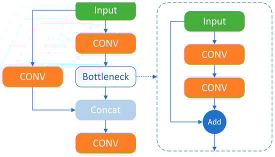 In YOLOv5, the depth and receptive field of the network are increased through the C3 module [], and the feature extraction ability of the network is improved. The C3 module is shown in Figure 4 and consists of three 3 × 3 Conv kernels and several bottleneck modules. Among them, the first one is a 1 × 1 Conv kernel with a step size of two, which halves the size of the feature map, reduces the number of parameters, and increases the receptive field of the network. The second and third modules have step sizes of 1 × 1 Conv kernels, and they retain more local information without changing the size of the feature map, further extract features, and increase the depth and receptive field of the network model. In the bottleneck module, the channel number of the image is reduced by half by a 1 × 1 Conv kernel with a step size of one, and then the number of channels of the image is doubled by a 1 × 1 Conv kernel with a step size of three. The number of channels of the image remains the same, the parameters of the network are reduced, and the depth is increased.