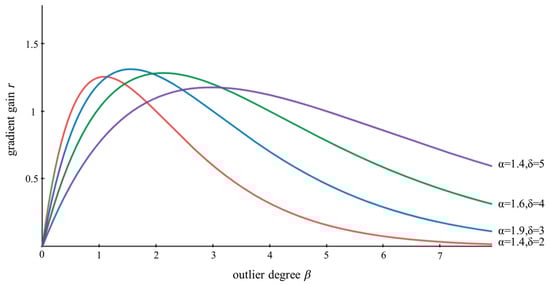 In Equations (5) and (6), β is the non-monotonic focusing coefficient and α and δ are hyperparameters. When β = δ, r = 1, and when the outlier degree of the anchor box satisfies β = C (C is a fixed value), the anchor box will obtain the highest gradient gain. The values of β and r are controlled by the hyperparameters α and δ. The relationship between the hyperparameters α and δ, the outlier β, and the gradient gain r is shown in Figure 7 [].