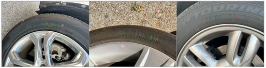 Automobile tires are an important part of automobile safety, and their design, manufacture, and use require strict standards and specifications []. The tire production process involves a large number of character marks, such as specifications, models, batches, and other information, which are of great significance for the quality control and traceability of tires. In the production of automobile tires, it is necessary to classify the tires according to the size of the specifications and different models. The traditional method of manually recognizing tire characters is time-consuming and inefficient and has a high error rate. Tire character recognition using machine vision is more effective than the traditional recognition method, but it has higher requirements for the recognition environment and harsher conditions. Therefore, it is of great practical significance to study an automatic tire identification method.