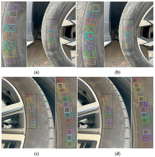 Further validation was performed using the original YOLOv5 network and the improved network proposed in this paper. The network models obtained from the ablation experiments were tested using the same set of images, and the test results are shown in Table 6. Among them, the improved YOLOv5 network increased the detection accuracy by 2.9%, the FPS (frame rate per second) increased by 5.3 f/s, the detection speed was faster, and the accuracy was improved. A comparison of the results is shown in Figure 9. In (a) and (c), the original YOLOv5 network was used, while in (b) and (d), the improved YOLOv5 network was used. By comparing the results, it was found that the improved network achieved higher confidence, improved accuracy, and better recognition performance when tested on the same set of images. This achieved a balance between speed and accuracy for car tire character recognition.