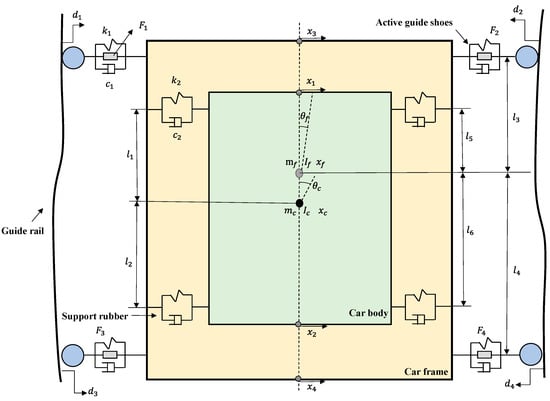 The elevator car is composed of a car body and a car frame. The car body is connected to the car frame through support rubber, and the four guide shoes guide the elevator to move. The guide shoes and the support rubber work together to reduce vibration. The elevator car is a relatively complex multi-degree of freedom vibration system. Referring to the experimentally validated model [14], we optimized the complex model [25] to obtain an elevator model that meets our requirements. The car system is simplified to the following lateral vibration dynamics model, as shown in Figure 1.