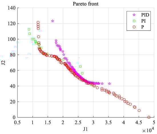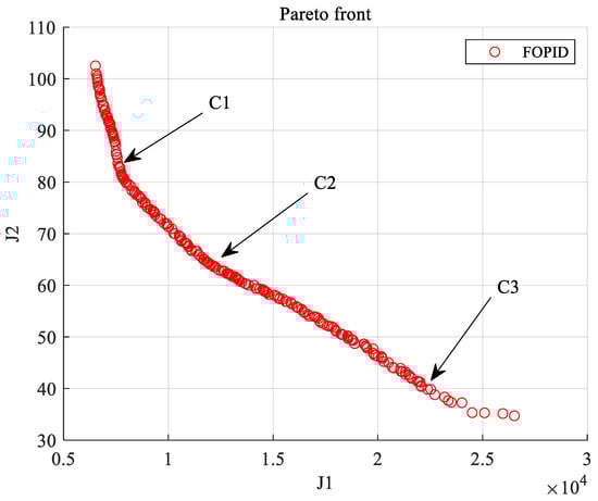 Using the same optimization algorithm to optimize the conventional PID controller, a Pareto solution set like the FOPID controller is obtained (Figure 12). The two curves are shown below. Using the controller C2 designed above as the comparison object, the control effects between PID and FOPID are compared and analyzed.