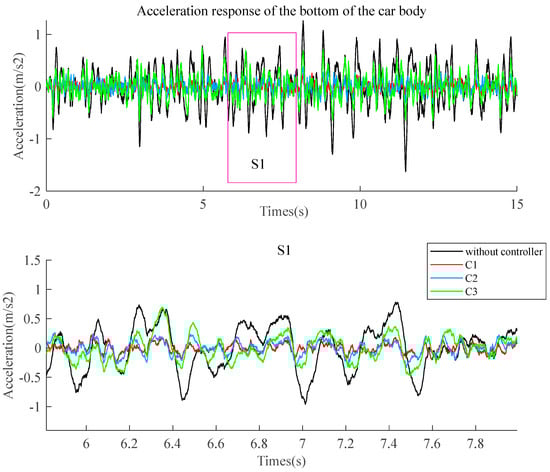 Figure 7 shows a comparison of the bottom horizontal acceleration of the car body with different controllers (, , ) and without control. According to the curve in Figure 7, compared to the case without control, the three groups of controllers can reduce the horizontal acceleration response. In the curve shown in Figure 6, the point near the vertical axis has better system performance and greater control costs. The controller parameters can be reasonably selected based on actual needs.