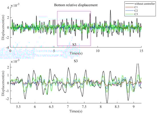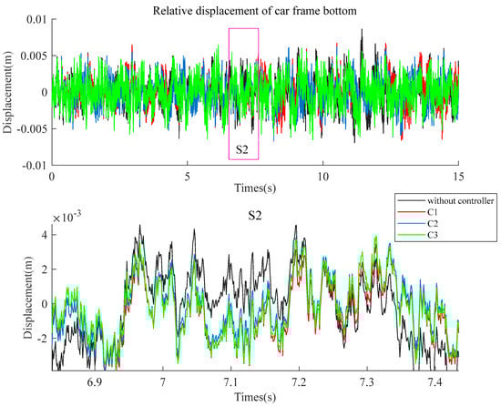 Figure 9 compares the bottom offset between the car body and frame under the control of three sets of controllers and without control. The curve results show that under the control of three sets of controllers (C1/C2/C3), the relative offset of the system decreases compared to the case without controllers.