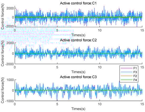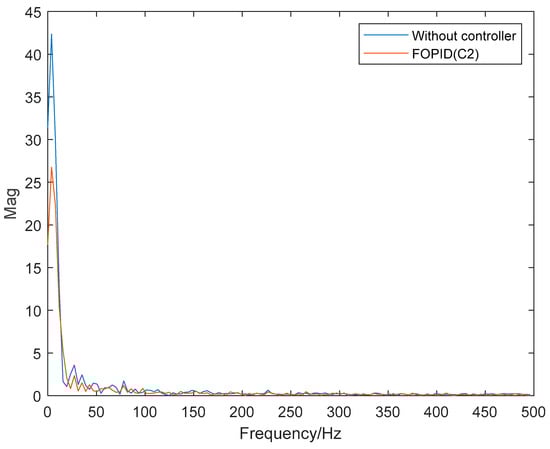 Figure 10 compares the magnitude of vibration without a controller and controlled by optimized FOPID controller C2. The vibration of the elevator is mainly caused by the excitation of the guide rail, and the energy of the guide rail excitation is mainly concentrated in the low-frequency region. Figure 10 shows that the optimized FOPID controller can effectively reduce the vibration amplitude of the elevator compared to no controller. Figure 11 compares the output forces of three group controllers (C1/C2/C3). The output force corresponding to the controller is proportional to the control cost.