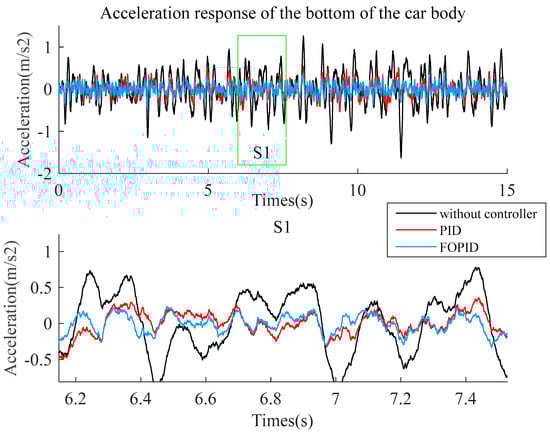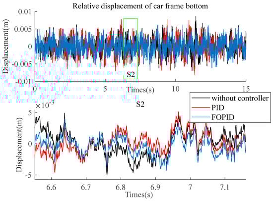 The control cost of the designed FOPID controller C2 is 77. Select a point on the PID curve where the control cost is similar and bring the corresponding parameters and PID controller into the model for simulation analysis. Figure 13 compares the horizontal acceleration under the control of two types of controllers, respectively. From the curve in Figure 13, compared to the PID controller, the horizontal acceleration controlled by the FOPID controller is smaller. Figure 14 compares the displacement at the car frame’s bottom relative to the centerline under two control situations. The two controllers have almost the same control effect on the bottom displacement relative to the centerline. Figure 15 shows the bottom offset between the car body and the car frame under two control situations. From Figure 15, the relative deviation of FOPID is slightly smaller than that of PID. Figure 16 compares the output forces of the active mechanism under the two controllers. From Figure 16, the output forces of the two controllers are almost the same because they have similar control costs.
