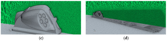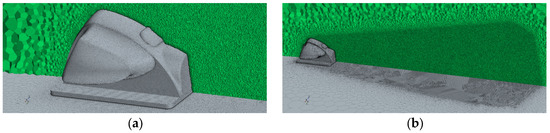 Unstructured grids were used for this investigation. The calculation model is shown in Figure 2. Considering that the device was installed on the top of the train and was far away from the head and tail of the train, the influence of the train shape on the flow field was ignored, and only the installation plane of the device was set as the fixed wall plane and as the boundary condition of the influence of the train roof; that is, the influence of the shape on the flow field could be simplified as the flow around the device installed on the fixed wall plane. Because the device was symmetrical and the incoming flow had no sideslip angle, the semi-model calculation could be adopted, whereby we took a distance that was 20 times the reference distance as the far-field pressure boundary, P = 101,325 Pa, and the temperature was 300 K. The calculation grid is shown in Figure 2. Among the grids, the positive grid quantity of configuration 1 was about 16 million, and the negative grid quantity of the form was about 15 million. The wake area was encrypted according to the different driving directions.