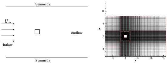 The case of square cylinder flow at a high Reynolds number was adopted to validate the numerical method. The Reynolds number was 2.2 × 104 based on the side length of the square, and the Mach number was 0.2. A set of grids contained 2.8 million cells, refined near the wall to ensure the y+ ≈ 1 for the first grid spacing. The physical time step was 0.005 s, and the Courant number during the inner iteration was 10. Figure 3 illustrates the computational field and grid distribution.