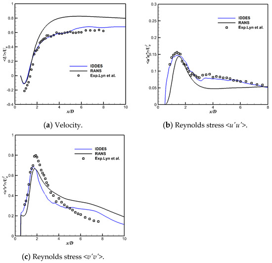 The Q criterion is commonly used to depict the coherent structures of the intricate wake flow. A detailed definition is provided in reference [23]. Figure 4 provides the Q isosurface distribution with a nondimensional Q = 0.45. The large-scale, three-dimensional vortex alternately shed in the wake. The quantitative results are provided and compared with the experiment results in Figure 5, which includes the time-averaged streamwise velocity and the Reynolds stress. The simulation results agreed with the experimental ones well, and we concluded that the numerical IDDES model provided higher numerical accuracy than the RANS model.