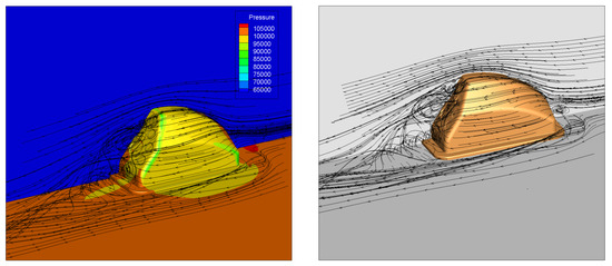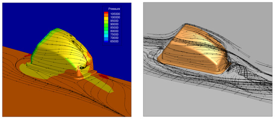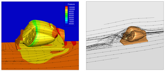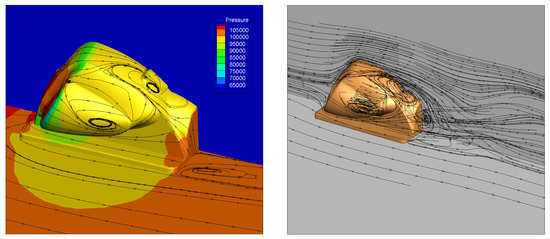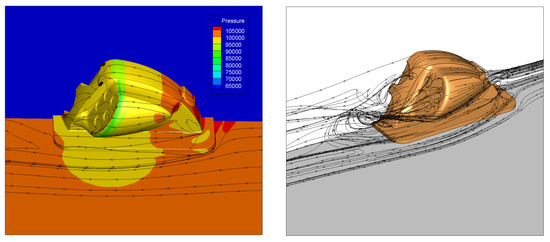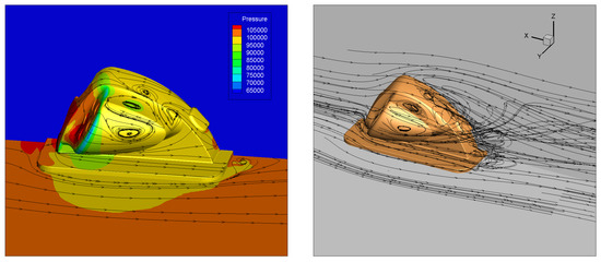 Figure 6, Figure 7, Figure 8, Figure 9, Figure 10 and Figure 11 show the pressure distribution and streamlines on the surface of the device, as well as the off-surface streamlines around the device under different working conditions. An evident high-pressure zone appeared on the windward side because the blockage effect of the device reduced the flow velocity; additionally, the low-pressure belt at the shoulder was induced by the flow acceleration when it bypassed the large-curved corner, and a reverse pressure gradient was formed because of the intense flow acceleration and the relatively higher pressure downstream of the shoulders. Then, the flow separated near the shoulders, forming a recirculation zone on the leeward side. The separation slowed down the pressure recovery and induced a pressure difference between the opposite sides, which contributed to the drag force of the device.