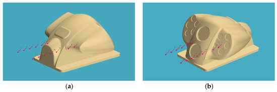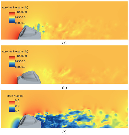 As shown in Figure 6, the area of the high-pressure zone on the windward side of configuration 1 was large under operating conditions. It was mainly distributed in the lower half of the two observation windows and the windward side of the two ears. About 1/3 of the total drag was caused by the two ears. Reducing the windward area of the two ears is appropriate when ignoring other design constraints. For example, increasing the sweep angles of the two sides of the ears can reduce the drag during forward driving. Figure 6 shows three dominant eddies downward from the leeward side of configuration 1 under operating conditions. They formed a large recirculation zone near the leeward side of the ear and the leeward area at the upper part of the inlet and behind the inlet. Therefore, the resistance under condition 1 was large. When driving in the reverse direction (condition 2), a similar pressure distribution existed as when driving in the forward direction. The area of the high-pressure zone at the two ears was smaller than that in condition 1. The relative position of the separation point was behind, and the backflow zone at the leeward side was also smaller. Therefore, the total drag was considerably reduced by about 50% compared with the reduction in the total drag in the forward direction.