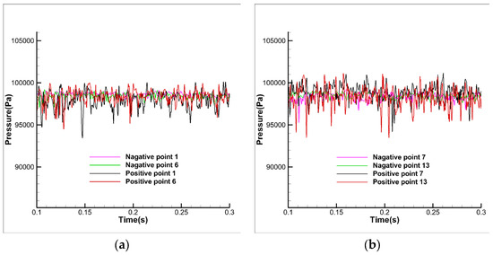 Figure 13 compares the pressure pulsations at different monitoring points during positive and negative operations. Figure 13a shows that the pressure pulsation at the center line of the forward operation was smaller than that of the negative operation, whether the point near the wall (point 1) or far away from the wall (point 6) was used. Figure 13b shows that the contrast between the positive and negative movement at the right monitoring point was consistent with the law at the center line. The overall pressure fluctuation of the right monitoring point was larger than that of the monitoring point at the center line. This was mainly because the right monitoring point was closer to the boundary of the external high-speed airflow and the airflow stagnation zone at the rear of the monitoring device and because the relationship between the mass transfer effect between different areas was more intense.