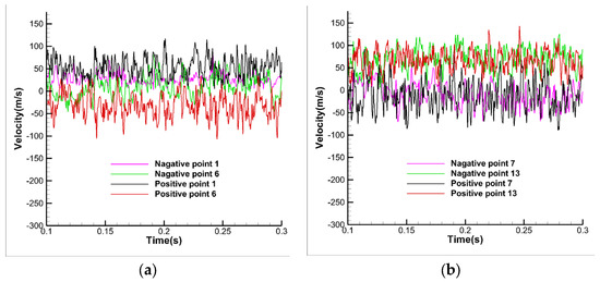 Figure 14 compares the pressure and velocity combinations at different monitoring points during the positive and negative operations. Figure 14a shows that at the center line, a large positive velocity was present at the point close to the wall (point 1), and a large reverse velocity was present at the point far away from the wall (point 6), which indicates that a small separation zone was present at the center line. During the reverse operation, a large positive velocity was also present at the point near the wall (point 1). In contrast, the velocity at the point far away from the wall (point 6) was 0, which indicated that this area was the velocity stagnation region. This could be mutually verified with the flow field structure shown in Figure 13. Figure 14a shows that the pressure pulsation at the monitoring point on the right side was consistent with the law of the pressure pulsation at the monitoring point during the positive and negative operation, both of which formed reflux near the wall; additionally, the velocity in the area far away from the wall was consistent with the outflow, which indicated that a certain separation flow area was also present on the right side, which is consistent with the spatial streamline shown in Figure 6 and Figure 7.