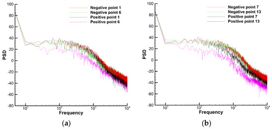 A power spectrum density (PSD) analysis was conducted to analyze the pressure time history. Figure 15 compares the power density spectra, whereby the pressure fluctuations at different monitoring points during the positive and negative operations are compared. The pressure fluctuation at the monitoring points in the wake area had no obvious peak value, and the PSD values of the points (points 1 and 7) close to the wall during the negative operation were considerably reduced, which showed that the flow near the wall in the leeward area was relatively stable during the negative operation.