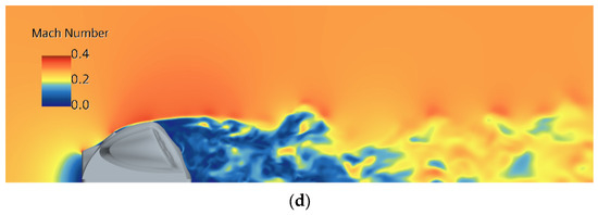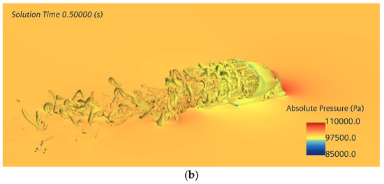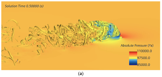 Figure 16 shows the characteristics of the wake separation using the Q isosurface colored according to the pressure. More abundant leeward vortex structures were present in the forward operation, and the influence of the separation zone was also wider, which was consistent with the performance of the overall aerodynamic drag.
