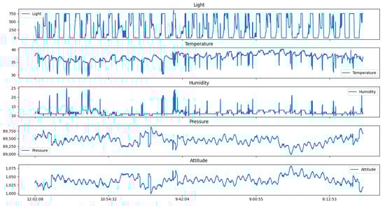 We selected the appropriate sensors based on the project’s objectives to measure the required parameters. These sensors were built on the Arduino board. The dataset was collected from six sensors using the Arduino board. Arduino boards can control and manage home activities, such as reading input from temperature, humidity, and light sensors. This research used six sensors, measuring temperature, humidity, pressure, altitude, light, and timestamps. Arduino boards read the sensor data in real time with a timestamp column.