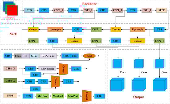 As an open source neural network, the YOLOv5 network achieves high performance in terms of detection speed and accuracy. With different network depths and feature map widths, the YOLOv5 network has four versions: YOLOv5s, YOLOv5m, YOLOv5l, and YOLOv5x. We experimented with all four deep YOLOv5 networks and found that the YOLOv5s network performed the best. Furthermore, YOLOv5s is the smallest model. Since the release of YOLOv5s, the network has been updated to version 6.2, and our experiments showed further improvement based on the model using version 6.0. In particular, the model of YOLOv5s mainly consists of an input (Input), backbone network (Backbone), neck (Neck), and output (Output). This network model is shown in Figure 1.