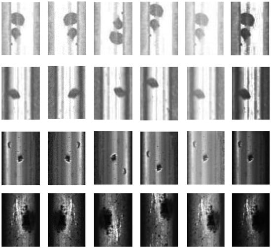 In this paper, the performance of the proposed method was verified using the publicly available Rail Surface Defect Dataset (RSDD). The dataset was collected and made public by Beijing Jiaotong University and consists of 195 challenging rail surface defect images, of which 67 are 160 pixels × 1000 pixels in size and 128 are 55 pixels × 1250 pixels in size. In the experiment, 347 rail surface defect images with a size of 160 pixels × 250 pixels and at least one defect were obtained after segmentation and image resizing, and an initial rail surface defect image sample dataset was established. Then, based on the initial established dataset, the dataset was expanded using flip transformation, random cropping, and brightness transformation. Finally, 3086 rail surface defect images were generated, of which we randomly selected 70% as the training set, 10% as the validation set, and 20% as the test set. The initial rail surface defect images used in this paper are shown in Figure 2, and the images generated using data enhancement methods are shown in Figure 3.