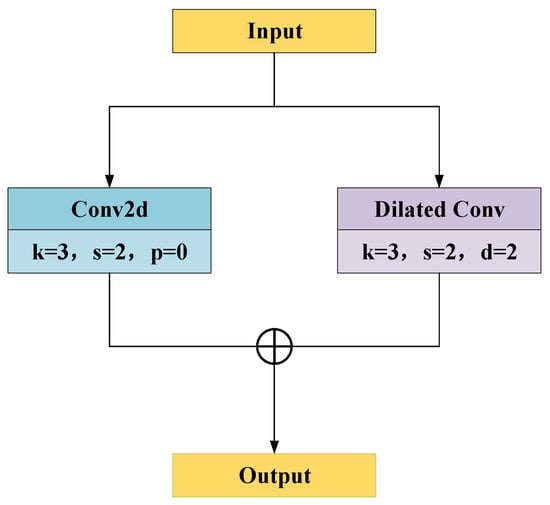 The traditional convolutional module of YOLOv5s performs Conv2D convolution, BN, and SiLU activation function operations on the input feature map, which greatly affect the speed. The CDConv designed by us changes the single channel into two channels: one channel represents the original Conv2D convolution, while the other channel represents the dilated convolution. The original 6 × 6 convolution is replaced with 3 × 3 convolution with the same step size; the padding of the Conv2D convolution is removed; and the padding of the dilated convolution is set to 2, so that the size of the output image remains the same as that of the Conv2D convolution. Finally, the two sides perform an Add operation to output the image feature map. The CDConv convolution module is shown in Figure 5.