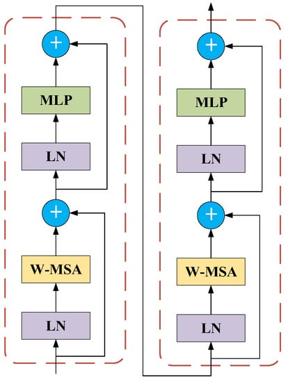 Due to the problem of small target sizes in the dataset, the detection of small object location information in the object detection layer of the downsampling of the original YOLOv5s network is limited. This makes the detected target not obvious and the detection accuracy is low. Therefore, background features should be reduced and target features should be highlighted in the detection process; using self-attention is a good method to achieve this. The transformer [33] is a method used in the field of natural language processing, and the Swin Transformer [34] is a modified network of the transformer. In this paper, we integrate the Swin Transformer module into the improved YOLOv5s network by combining the C3 module of the original network into the Backbone tail and the Neck tail. This is performed in order to improve the localization of rail surface defects by exploiting both the high-resolution spatial information of the CNN features and the global semantic information encoded by the Swin Transformer. The Swin Transformer Block (STB) consists of two subunits in pairs: the window-based multi-head self-attention (W-MSA) module and the sliding window-based multi-head self-attention (SW-MSA) module. Each subunit is composed of a layer normalization (LN), an attention module, a normalization layer, and a multi-layer perceptron (MLP). The computational procedure of the Swin Transformer Block is shown in Figure 6.