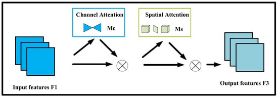 where represents the input feature, represents the intermediate state, represents the output feature, is the channel attention module, and is the spatial attention module.