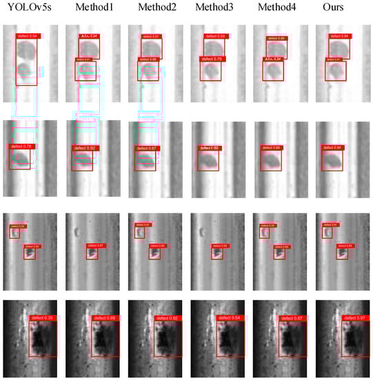 The first row of Table 1 shows the unimproved YOLOv5s model, where the mean average precision of rail surface defects is 95.4%. Then, the trunk and header were improved, respectively. After the addition of the CDConv module and C3STR in the second and third lines, the mAP was significantly improved, reaching 96.1% and 96.3%, respectively. The reason is that the CDConv module greatly reduces the calculation amount of network parameters, and the model detection speed is improved; however, some information may be lost. The Swin Transformer combined with the C3 module completed the global information and richer context information. Then, the attention mechanisms, CBAM and GAM, were added to the Head for comparison. It was found that the network model with the GAM achieved better detection accuracy. Although both CBAM and GAM are mixed attention mechanisms, CBAM does not consider the interaction between the two dimensions, which may lead to the separation of feature vectors and the loss of inter-dimensional information. Therefore, we chose the GAM for its superior performance. Finally, the Soft-SIoUNMS loss function, which is a combination of SIoU and Soft-NMS, was added, providing a better effect than a single loss function. The experimental results showed that the mAP of our proposed method reached 96.9%, achieving the best detection results. The detection diagram in Figure 8 corresponds to the different methods used in the ablation experiments in Table 1. In order to better demonstrate the benefits of the improved model on the rail surface defect dataset, each improvement point will be validated separately.