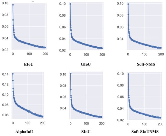 This paper compares several mainstream loss functions, including the latest AlphaIoU and SIoU, and finds that the combination of SIoU and Soft-NMS to make the function, Soft-SIoUNMS, achieves the best detection effect through experiments. The comparison of defect detection loss values of different loss functions is shown in Figure 9. In order to more intuitively reflect the difference between the improved loss and the original loss function, we compare them. Figure 10 is a comparison of the original CIoU and the improved Soft-SIoUNMS.