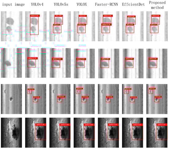 In this paper, the performance of the proposed algorithm and some other classical algorithms for rail surface defect detection were compared experimentally. The experimental results are shown in Table 5, where it can be seen that the improved YOLOv5s algorithm proposed in this paper achieved the highest detection accuracy. Compared with YOLOv4 [27], the unimproved YOLOv5s algorithm, YOLOX [39], Faster R-CNN [18], and EfficientDet, the improved YOLOv5S algorithm achieved the highest detection accuracy, with mAP increased by 6.53, 1.47, 1.06, 2.47, and 6.09 percentage points, respectively.