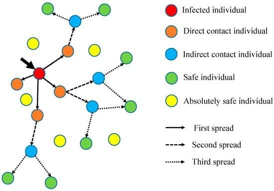 - The initial number of infected individuals is small, and they are randomly distributed in the population. The category to which an individual currently belongs and the corresponding update formula are determined based on the distance between the individual and the infected individual;