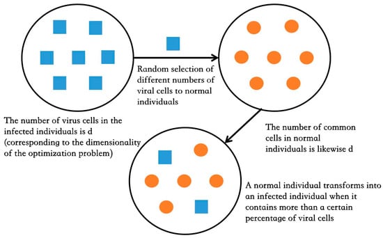 When the contact distance between individuals in the population and infected individuals is , the position is updated by Equation (6). is the random acquisition of viral cells by highly susceptible individuals; α represents update coefficient at the contact distance of . When the number of exchanged cells exceeds a quarter of the total number of cells, the highly susceptible individuals are transformed into infected individuals. Cell exchange occurs only once during each iteration, and the number of exchanges is random.