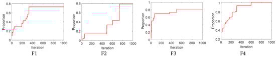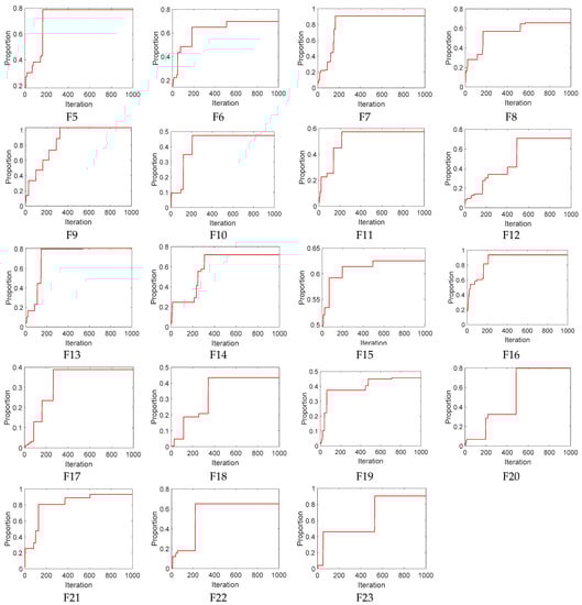 Figure 3 shows the proportion of immune individuals to the entire population with the 23 sets of standard test functions run by IVIA. From the figure, except for functions F4, F7, F9, F16, F21, and F23, all the remaining 17 tested functions stop the iterative search process when the population immunity rate reaches 0.8. In this paper, the minimum population immunity rate for IVIA is set at 0.8, i.e., the search for optimization stops when the number of immunized individuals in the population exceeds 80% of the total. It ensures that the algorithm has high optimization results.