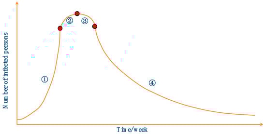 In this paper, we propose the IVIA based on the transmission and immunization process of the influenza virus. The influenza virus spreads rapidly in a population, and the growth curve of the cumulative number of infections is shown in Figure 4. Curve ① indicates that the number of infected individuals in the population increases rapidly within 2~3 weeks, and curves ② and ③ indicate that the number of infected individuals peaks at 7~8 weeks and then gradually starts to decline. Curve ④ indicates that the number of infected individuals gradually decreases and the number of immunized individuals increases near the end of this influenza outbreak. The IVIA has a good optimization capability at the beginning of the iteration. Figure 4 is a schematic diagram summarized according to the epidemic transmission rules; the website of the epidemic transmission rules is shown below.