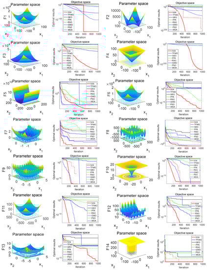 Table 1 shows the expression of the test function, the dimension of the optimization problem, and the overall search range, and the last column shows the minimum value of the test function expectation, which is the theoretical optimum. The IVIA population size is 30, the maximum number of iterations is 1000, the maximum safe contact distance is , and the population immunity rate is 80% during the test period. The number of dimensions of the test function and the parameters, such as search intervals and , are set according to Table 1. The overall and iteration numbers of the other optimization functions are the same as those of the IVIA.