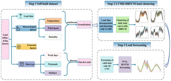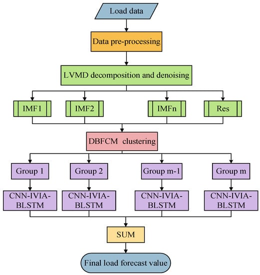 In this paper, we propose a method for power load forecasting based on LVMD-DBFCM load curve clustering, and the CNN-IVIA-BLSTM model is shown in Figure 6. First, data preprocessing is performed, and the influences of load are divided into continuous and discrete series. After normalizing the continuous sequences, they include load data, meteorological data (temperature, wind speed, and humidity), and economic factors. One-hot encoding is applied to discrete sequences, and the discrete sequences include the data types of workdays, weekends, and holidays. Load data decomposition and denoising with LVMD are performed on the preprocessed data. Then, the power load curve is clustered using the DBFCM algorithm. The processed data are extracted with a 1D CNN for feature extraction and finally, predicted with the IVIA-BLSTM model.