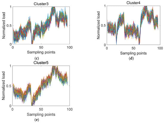 (a–e) Daily load curve after LVMD-DBFCM clustering when the number of clusters is determined to be 5.