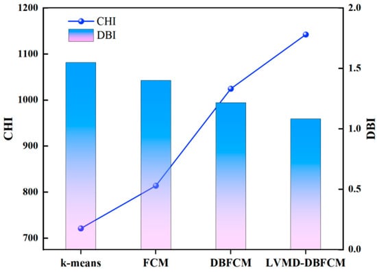 The clustering algorithm proposed in this paper is compared with k-means [], FCM [], and DBFCM. Their comparison is displayed in Table 3 and Figure 16. From the results, it can be seen that the maximum value of the CHI metric is 1142.509 and the minimum value of the DBI metric is 1.083. The clustering validity of the method proposed in this paper is better than that of the other three methods.