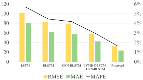 The comparison between the prediction model proposed in this paper and the four models LSTM, BLSTM, CNN-BLSTM, and LVMD-DBFCM+CNN-BLSTM using three load evaluation indices, RMSE, MAE, and MAPE, is shown in Table 4 and Figure 17. From the results, we can see that the prediction models proposed in this paper have better prediction results than the other four models in all evaluation indices.