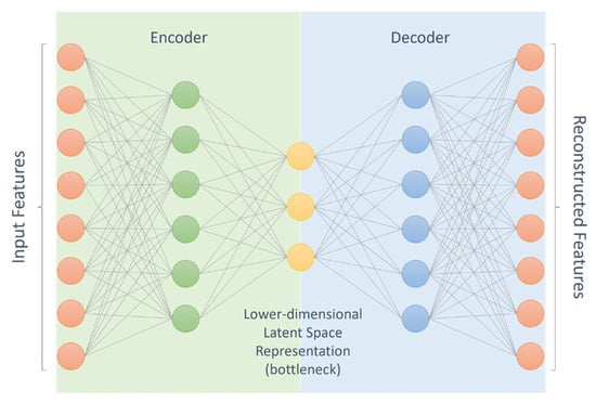 Autoencoders are a type of neural network where the input is the same as the output [13]. They are an unsupervised learning technique. Thus, they can be trained with unlabeled data. The autoencoders have two main components: an encoder and a decoder (see Figure 1). The output of the encoder is a latent (or semantic) representation of the input, usually of a lower dimension. The decoder can reconstruct the input using that lower-dimensional representation. Then, autoencoders allow for the dimensions of the input data to be reduced, while extracting their main characteristics.