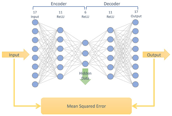 We implemented a fully connected symmetric autoencoder with 4 dense layers (see Figure 3). The number of nodes in each layer, as well as the activation function, were chosen to minimize reconstruction errors. We found the best option to be 11 nodes for the first hidden layer and 6 nodes for the low-dimensional layer (latent space). Moreover, the encoder and decoder used Rectified Linear Units (ReLU) as the activation function and were trained using the Mean Squared Error as the loss function.