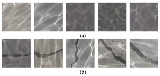 Example of the augmented dataset. Concrete images without cracks and with underwater optical effects are depicted in panel (a). Concrete images with cracks and with underwater optical effects are depicted in panel (b).