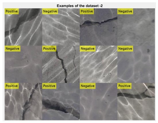 The test of the deep learning method was performed using concrete crack images with and without underwater optical effects. The method used for the generation of underwater optical effects was presented in [59]. The collection contains 40,000 photos of surfaces with and without concrete fractures (20,000 with cracks—“Positive” and 20,000 without cracks—“Negative”) from Ozgenel’s released dataset, which was used for the test [61]. Optical water illusion effects were generated using the technique depicted in [59], and various modifications (random rotation, zoom, height, width) and different blending techniques were employed for dataset augmentation. For the image classification, 40,000 distinct optical underwater effects were generated and applied to the whole dataset of images with and without cracks; see Figure 1. The technique of image augmentation is presented in detail in [59].