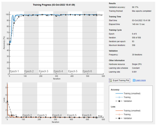 Training progress plots and training parameters for Case 3 using AlexNet, with training ( data), testing ( data), and validation data () using of the total data.